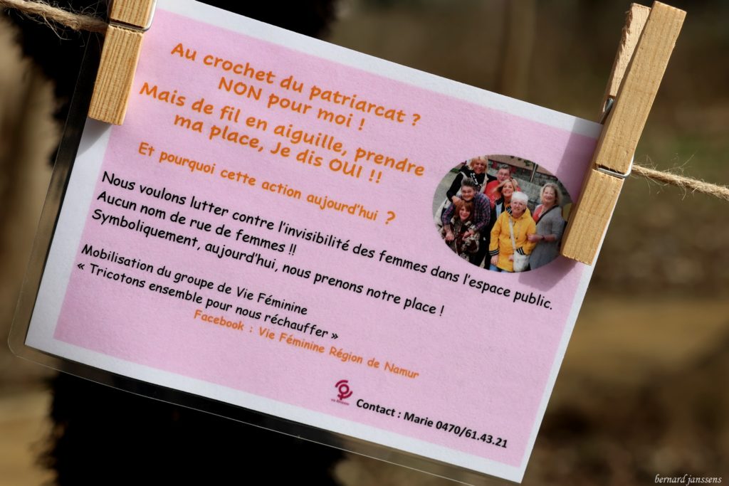 Le 8 mars c’est la journée internationale des droits des femmes. Vie Féminine Région Namur lutte contre l’invisibilité des femmes. Elles ne veulent pas vivre au crochet du patriarcat ; de fil en aiguille, elles prennent leur place. Elles tricotent pour nous réchauffer !